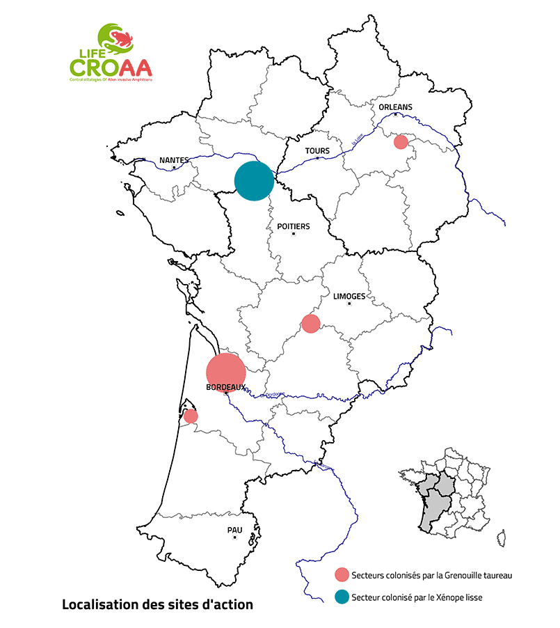 Le programme LIFE CROAA (Control stRategies Of Alien invasive Amphibians) s’est déroulé de 2016 à 2022. Financé grâce au concours de la Commission Européenne, il s’est donné pour objectif de contribuer à l’amélioration de l’état de conservation des écosystèmes aquatiques et des populations autochtones d’Amphibiens et d’invertébrés aquatiques, affaiblis par la présence de deux amphibiens exotiques envahissants : le Xénope lisse (Xenopus laevis) et la Grenouille Taureau (Lithobates catesbeianus).