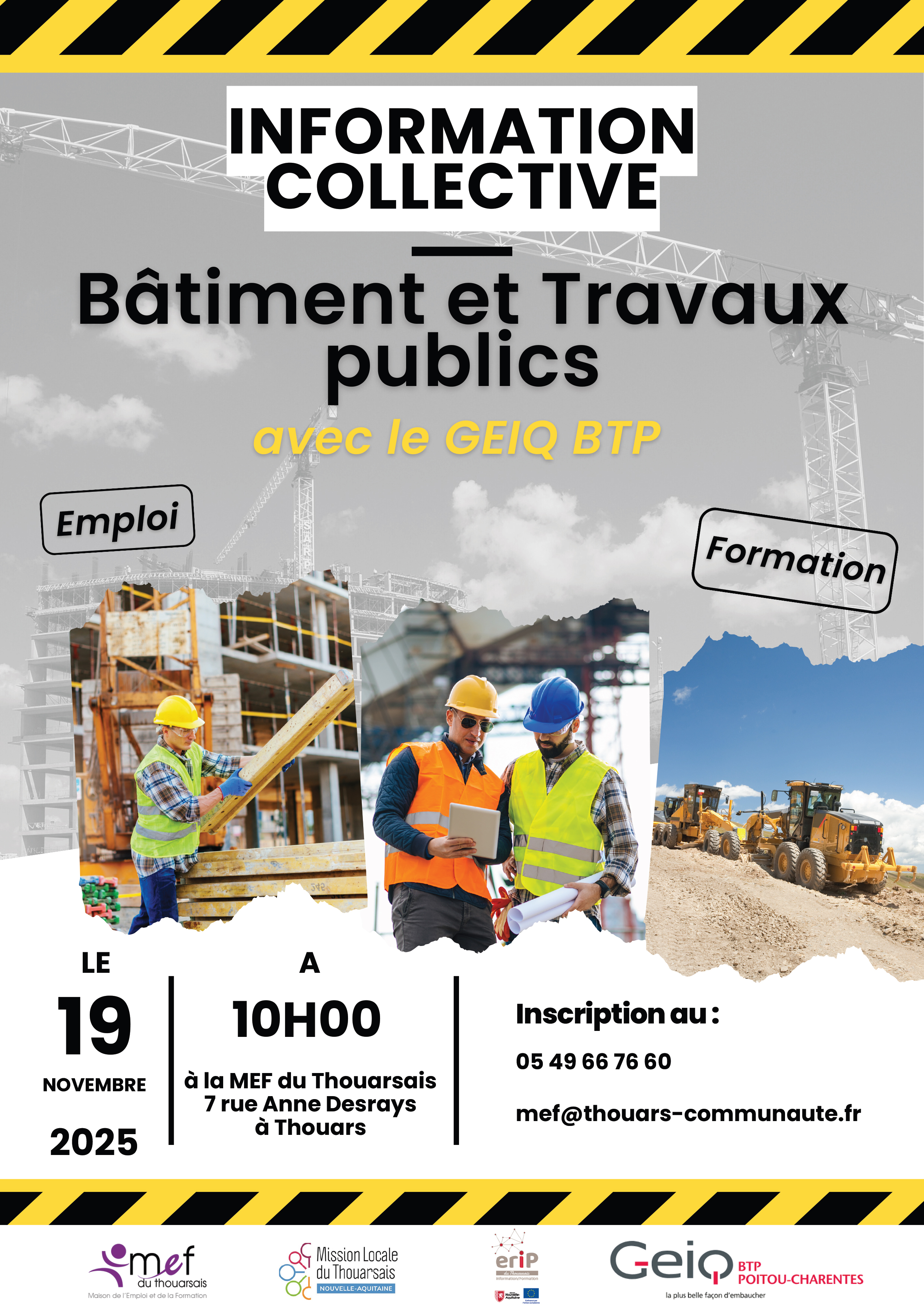 Le 19 novembre à la MEF du Thouarsais - 7 rue Anne Desrays - Information collective : Bâtiment et travaux publics Inscription : 05 49 66 76 60